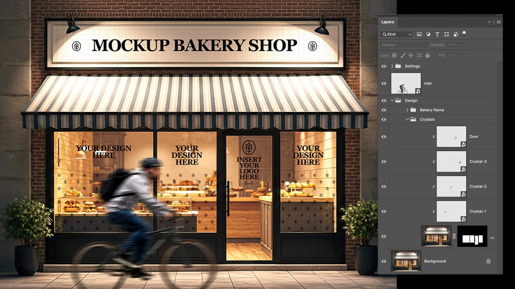 This is a high-resolution, fully layered Photoshop mockup of a cozy urban bakery storefront, perfect for showcasing your logo, signage, and window decal designs. The scene includes editable Smart Objects for all main branding areas, warm lighting, a striped awning, and a motion-blurred cyclist for a realistic, dynamic presentation. It is ideal for bakery branding, window graphics, or small business identity projects.