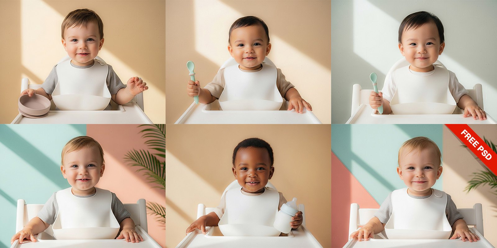 Each scene highlights different babies, moods, hand positions, and props (bottle, spoon, bowl), giving you a versatile collection ideal for full brand presentations and product lines.