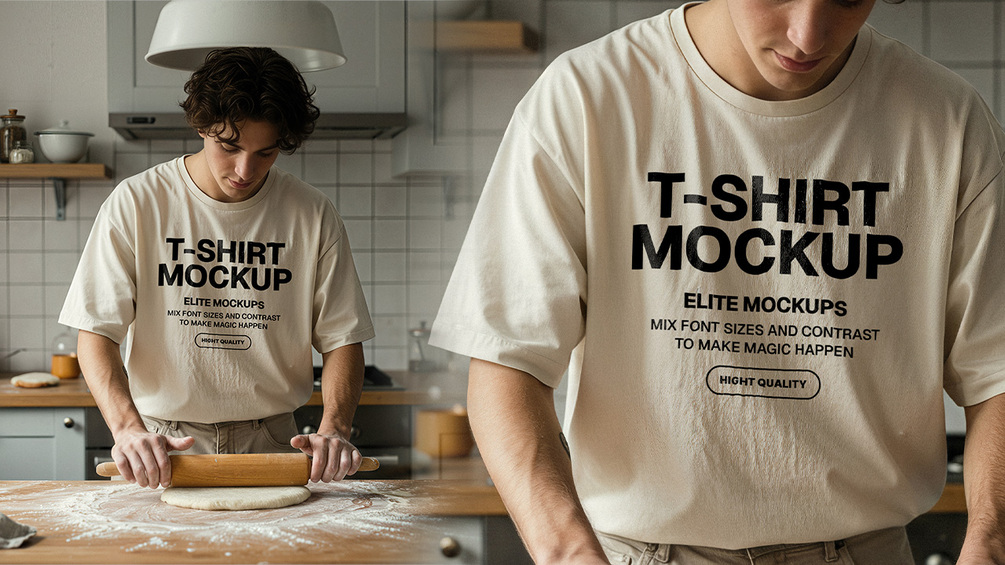 This high-resolution Photoshop mockup pack features a stylish trio of kitchen scenes, each fully layered and Smart Object ready. The collection includes a senior chef in a pristine white uniform (with editable branding on the jacket and hat), a woman in a neutral-toned t-shirt, and a man in a matching tee — all rolling dough in aesthetically pleasing kitchen setups. Perfect for branding culinary apparel, chefwear, and casual kitchen-themed clothing lines.