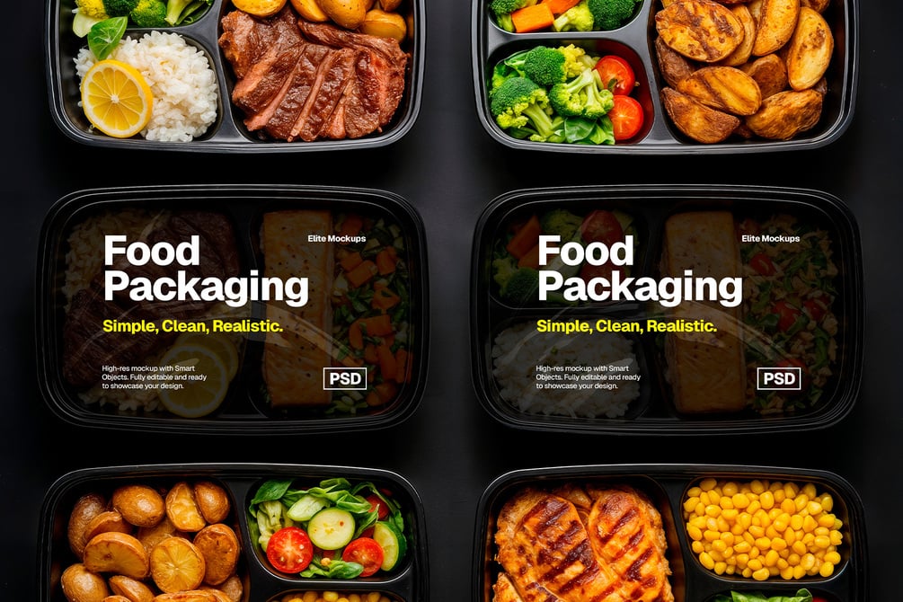 This Photoshop mockup is designed to showcase your food packaging designs in the most professional way. Featuring multiple ready-to-edit containers filled with realistic meals, it allows you to insert your branding or label artwork with just a few clicks. Ideal for restaurant branding, catering services, or healthy meal delivery presentations, this mockup provides a clean and photorealistic look that elevates your packaging projects.