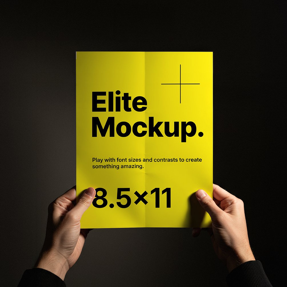 Photoshop template featuring two hands holding a letter-sized sheet against a black background with studio lighting. High-resolution (5632x3072 px) and optimized with Smart Objects for easy customization.