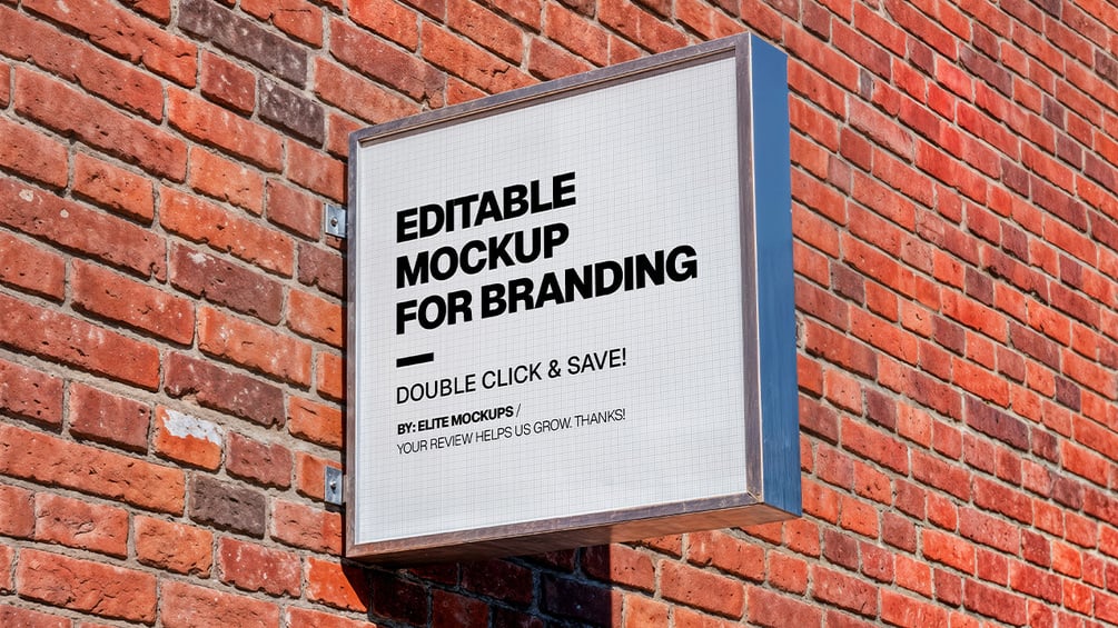 This high-resolution Photoshop mockup features a street-style square sign mounted on a rustic red brick wall. The signage panel is clean, angled in perspective, and fully customizable via Smart Objects, ideal for showcasing logos, brand slogans, or storefront identities. Perfect for presenting urban branding, outdoor advertising, or signage design with a realistic touch and professional layout.