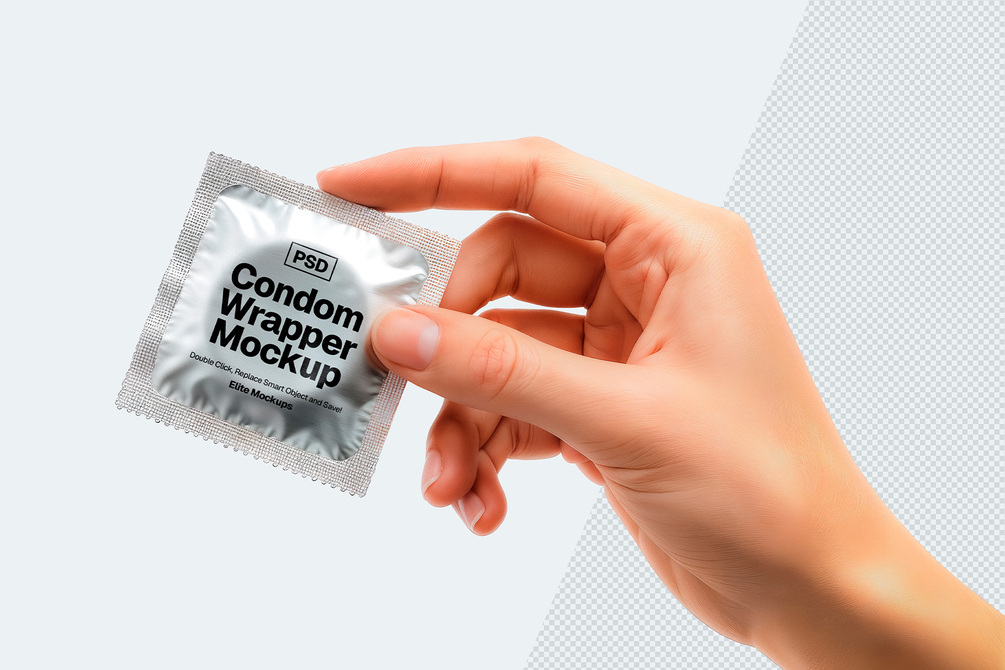 High-resolution Photoshop mockup of a condom wrapper held in hand. Fully editable PSD with Smart Objects, organized layers, and realistic metallic textures. Perfect for branding, packaging, and product presentations.
