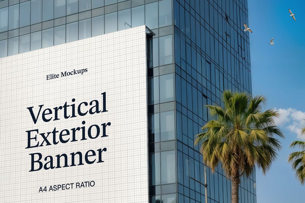 This mockup presents a vertical exterior banner mounted on the façade of a tall glass building in a sunny city setting. Surrounded by palm trees and modern streetscape, it provides an authentic urban vibe for showcasing advertising designs. With Smart Object integration, you can insert your own graphics effortlessly, ensuring your work looks bold and professional in real-world conditions.