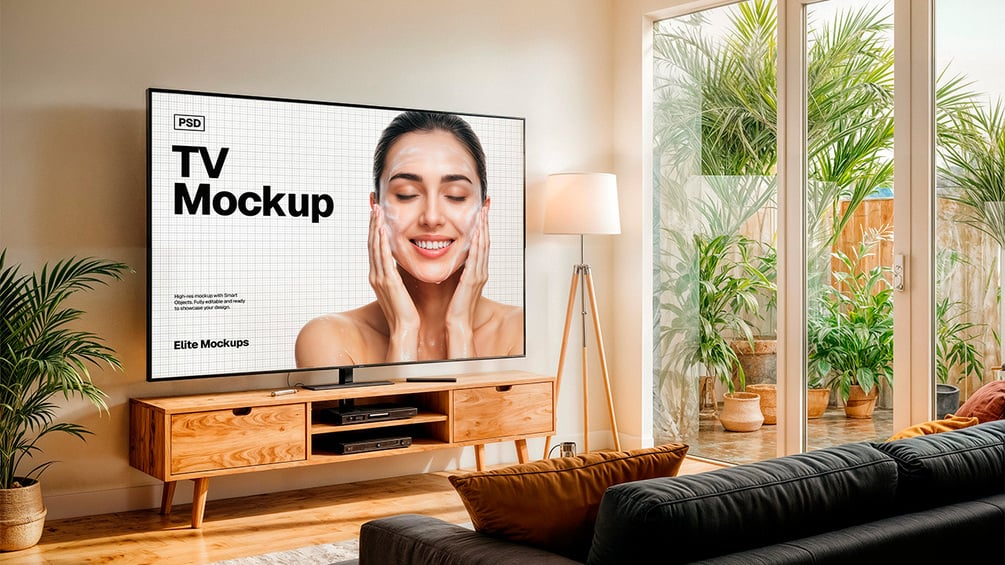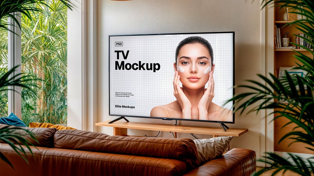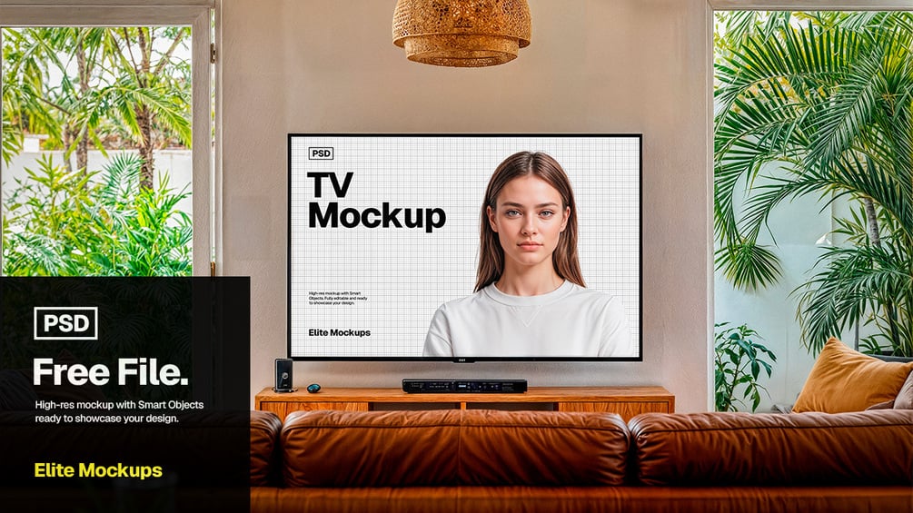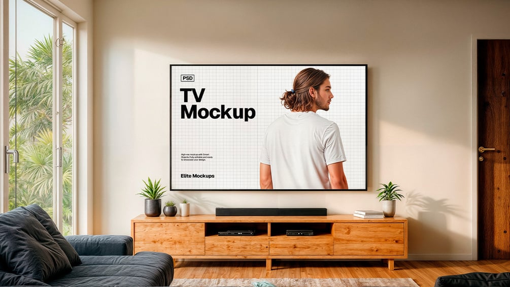 This high-quality Photoshop mockup bundle includes 6 ultra-realistic living room scenes, styled with tropical décor, wooden furniture, and soft natural lighting. Each PSD is fully layered and editable via Smart Objects—perfect for presenting your videos, apps, ads, or creative projects on a 75" TV screen.