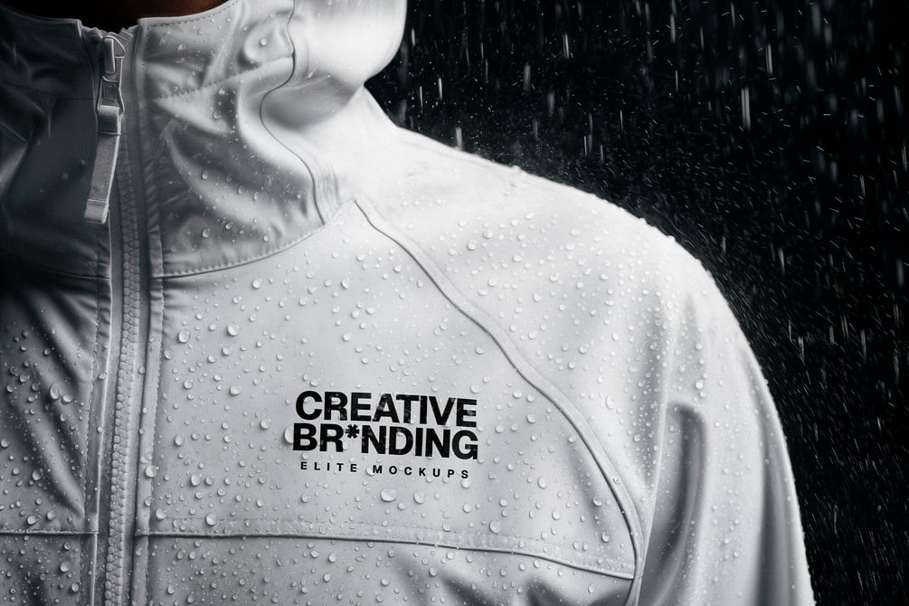 High-resolution Photoshop mockup of a waterproof jacket, showcasing a sleek, realistic look with water droplets and soft directional lighting. Perfect for presenting branding, outdoor wear, or sports apparel designs with a professional, weatherproof aesthetic.