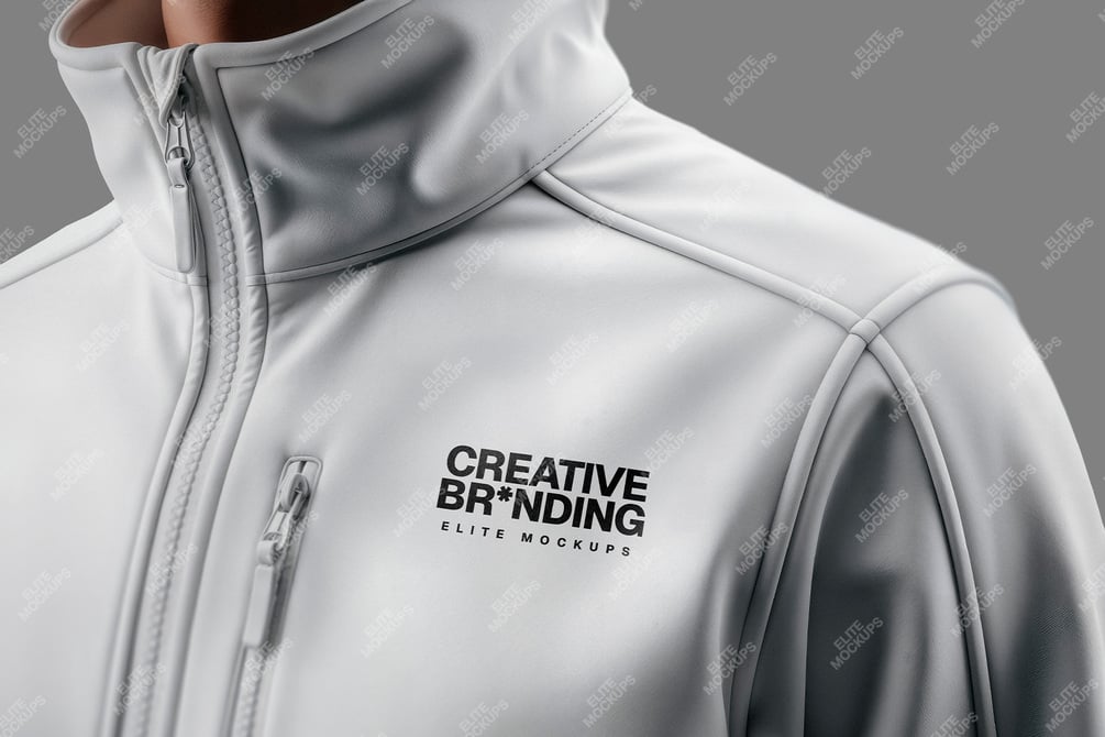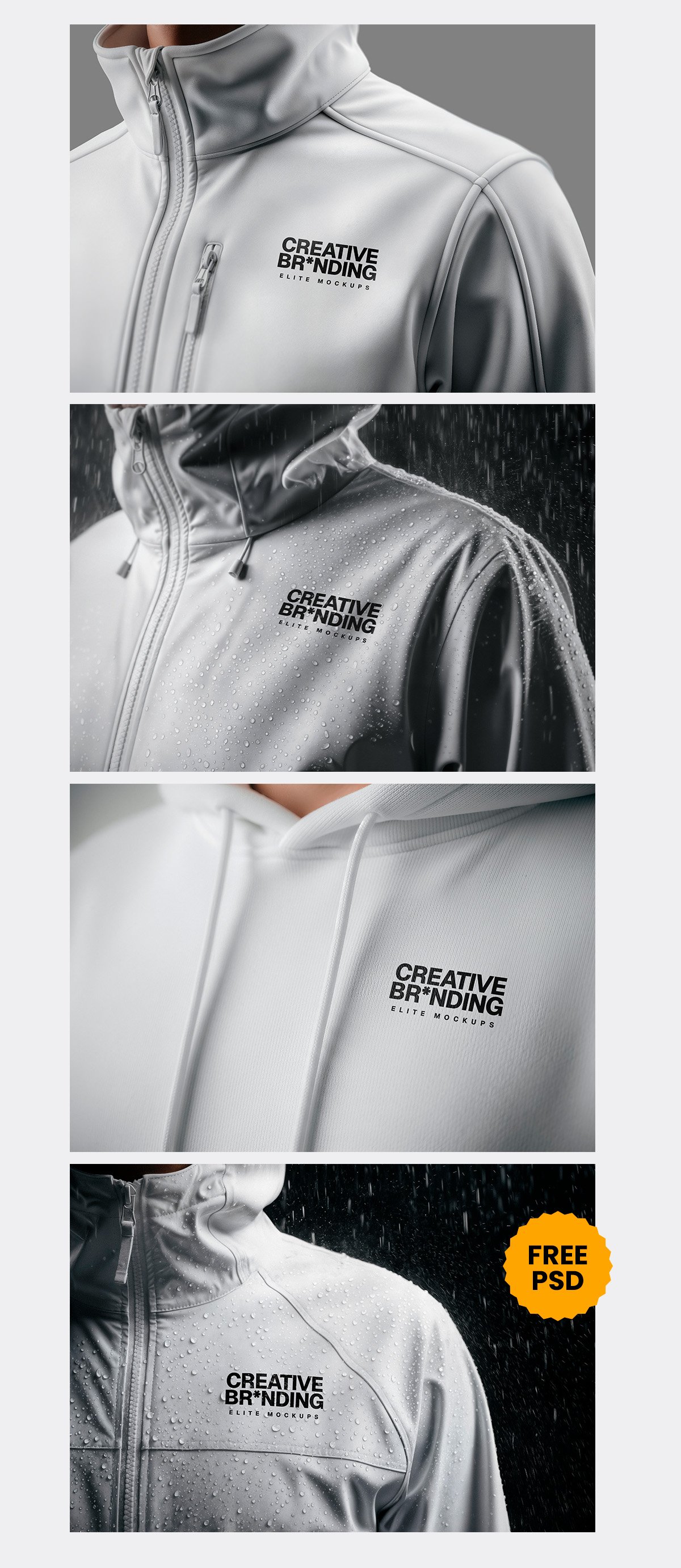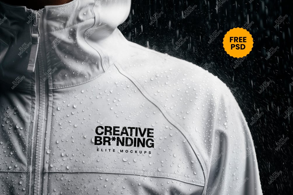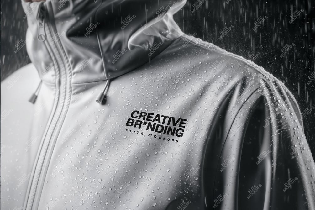 High-resolution Photoshop mockup of a waterproof jacket, showcasing a sleek, realistic look with water droplets and soft directional lighting. Perfect for presenting branding, outdoor wear, or sports apparel designs with a professional, weatherproof aesthetic.